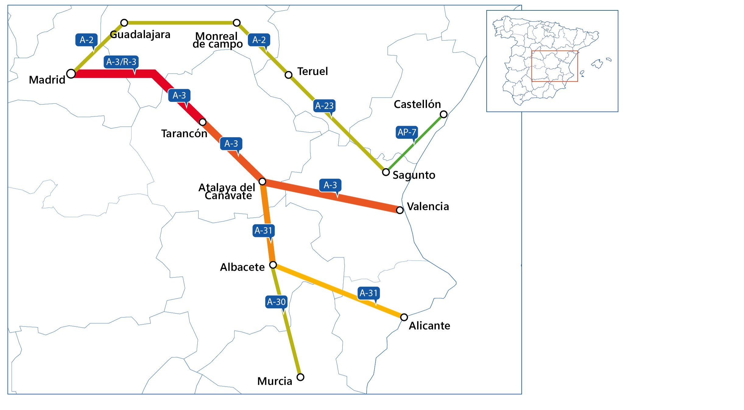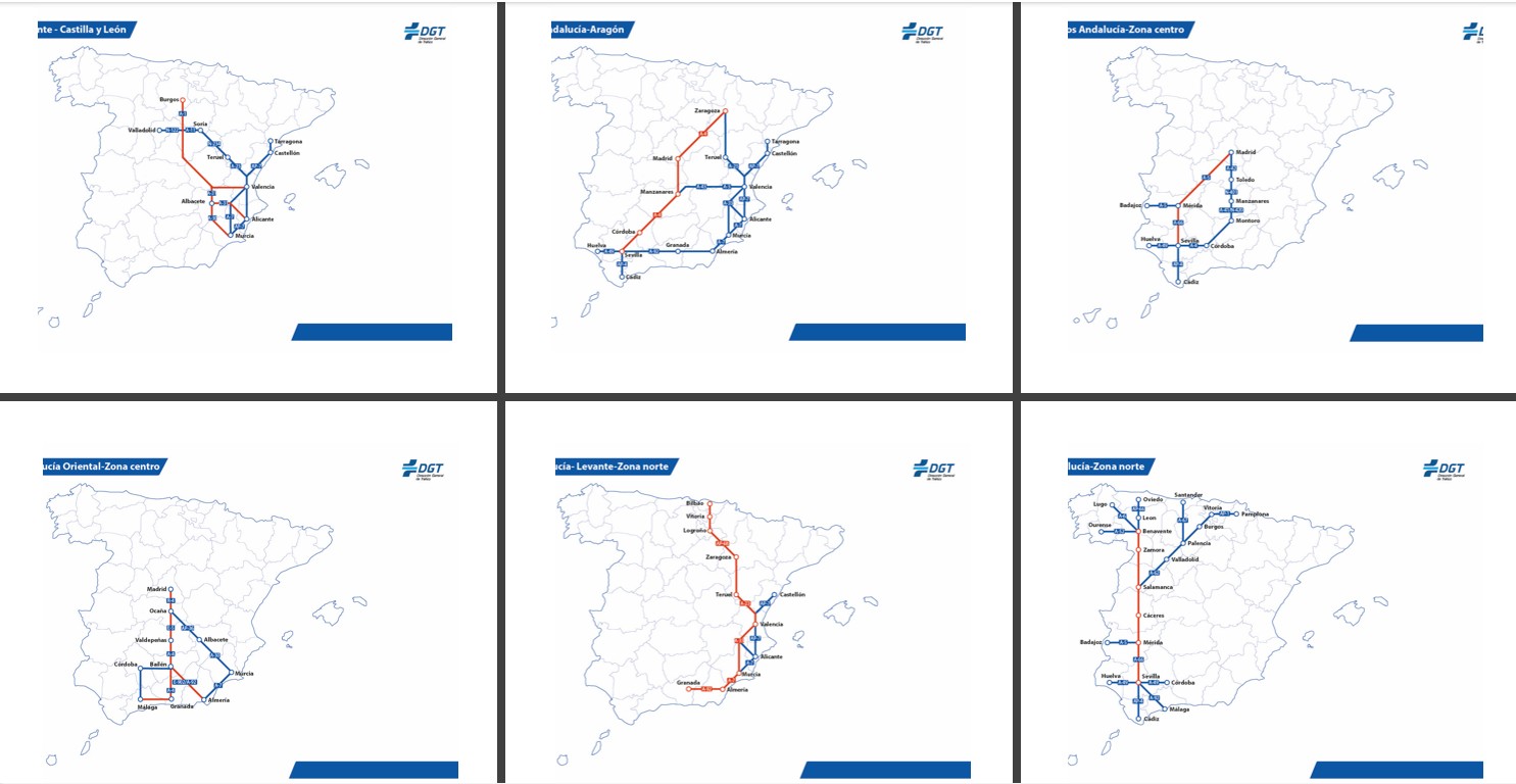 Todos ellos parten de Madrid hacia Andalucía, Levante y la cornisa cantábrica-, así como recorridos alternativos que pueden contribuir a distribuir el tráfico y ayudar a los conductores a optar por vías de mayor fluidez para evitar congestiones en los tramos más saturados.