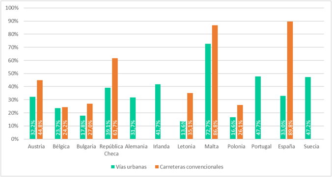 En el caso español, el nivel de cumplimiento del límite de velocidad establecido varía en función del tipo de vía. Mientras que en autovía el 63% de los turismos circulan a la velocidad permitida (valor alto en comparación con otros países), en las autopistas este porcentaje baja al 51%. En el caso de las carreteras convencionales, el cumplimiento del límite de velocidad establecido es del 43%, un nivel bajo, similar al que registra Bélgica (46%).