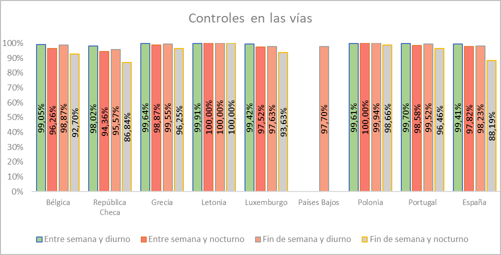 El porcentaje de conductores que dieron negativo a las pruebas de alcohol realizadas por los agentes de tráfico varió entre un 96% en autopista y autovía y un 98% en ciudad. El valor más bajo de negativos, un 88%, se observó en las noches de fines de semana, el segundo valor más bajo entre todos los países con datos.