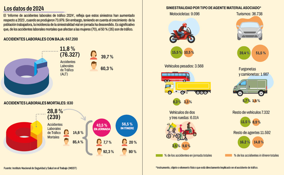 Destaca, además, que el 72 % de los siniestros laborales viales ocurren en el trayecto al lugar de trabajo o desde este al domicilio. Son los llamados accidentes in itinere. Frente a ellos, los siniestros de tráfico que tienen lugar durante el horario laboral, los accidentes en jornada, suponen el 28 % del total de siniestros de tráfico relacionados con el trabajo.