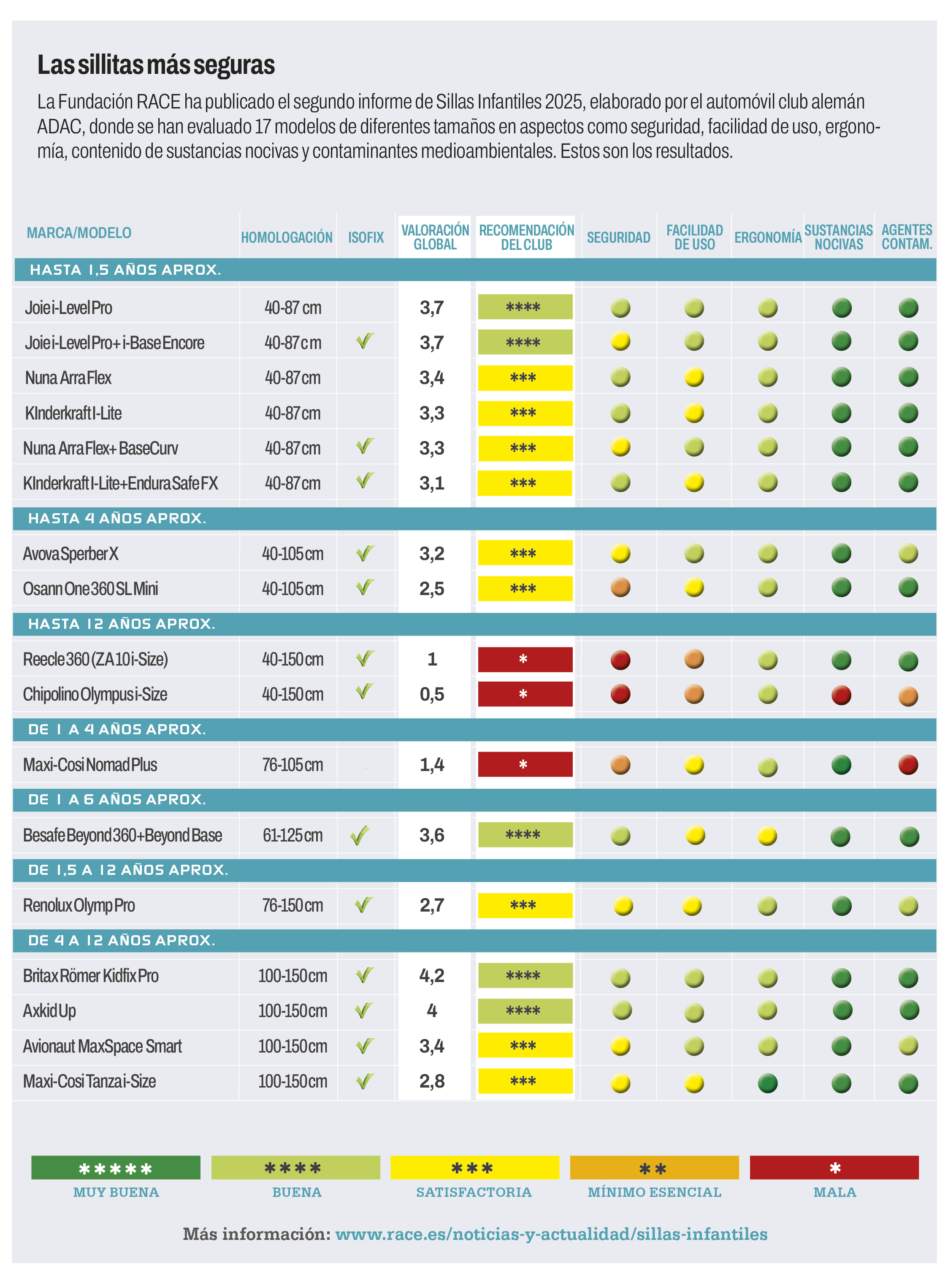 La Fundación RACE ha publicado el segundo informe de Sillas Infantiles 2025, elaborado por el automóvil club alemán ADAC, donde se han evaluado 17 modelos de diferentes tamaños en aspectos como seguridad, facilidad de uso, ergonomía, contenido de sustancias nocivas y contaminantes medioambientales. Estos son los resultados.