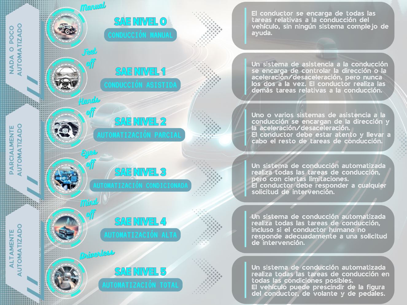El desarrollo y uso de estas tecnologías incide directamente en las capacidades del vehículo de conducirse por sí mismo. Existen diferentes clasificaciones del nivel de automatización de vehículos, como la impulsada por la Sociedad de Ingenieros de Automoción (SAE), que clasifica el nivel de automatización en función del nivel de atención e intervención del humano en la conducción. Este estándar define seis niveles de automatización, de 0 (ninguna automatización) a 5 (vehículo completamente autónomo).