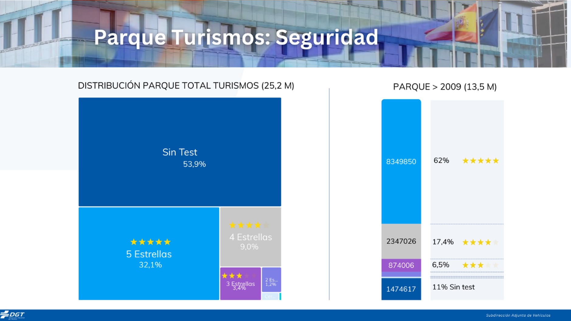 Los datos a fecha de 31 de diciembre de 2024 reflejan que el parque de vehículos matriculados a partir de 2009 es de cerca de 13,5 millones, de los cuales el 62% tiene 5 estrellas EuroNCAP (máximo de clasificación) y el 17,4% cuatro estrellas.